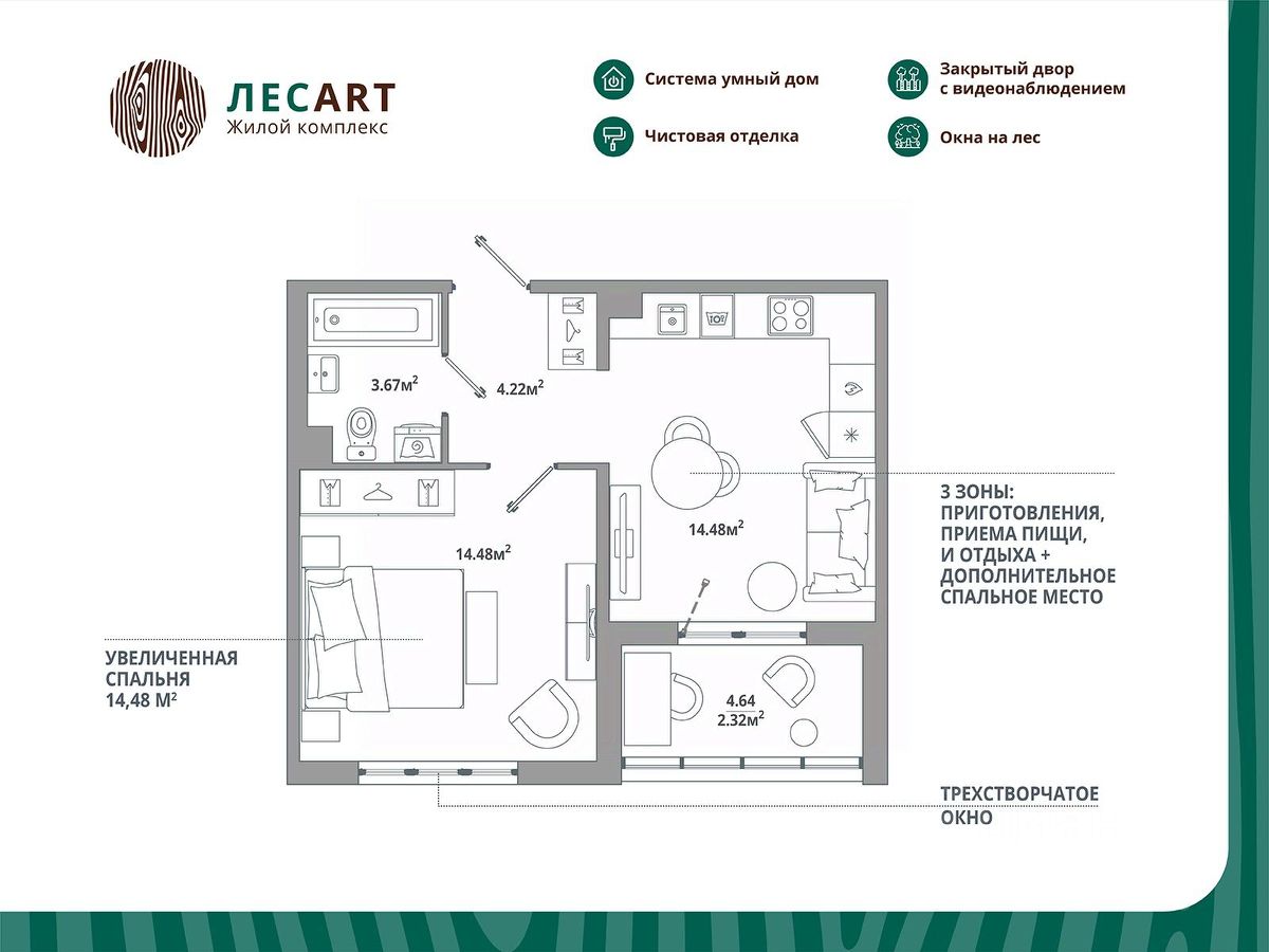Продаётся 1-комнатная квартира 075, общей площадью 39.17 кв.м., на 4. Дом комфорт-класса, 12 этажей, в окружении леса и малоэтажной застройки. Проект с умным домом. Передача квартир в апреле 2026г.