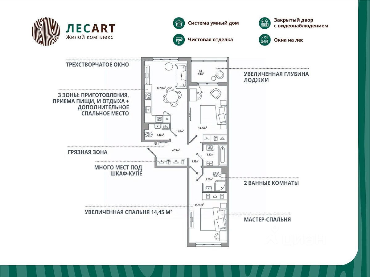 Продаётся 2-комнатная квартира 093, общей площадью 65.22 кв.м., на 9. Дом комфорт-класса, 12 этажей, в окружении леса и малоэтажной застройки. Проект с умным домом. Передача квартир в апреле 2026г.