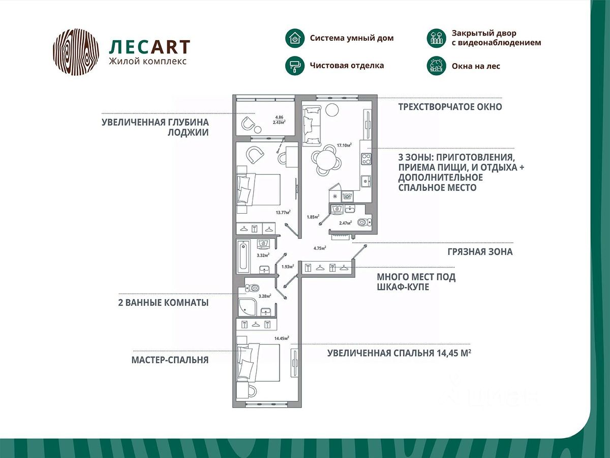 Продаётся 2-комнатная квартира 076, общей площадью 65.35 кв.м., на 4. Дом комфорт-класса, 12 этажей, в окружении леса и малоэтажной застройки. Проект с умным домом. Передача квартир в апреле 2026г.