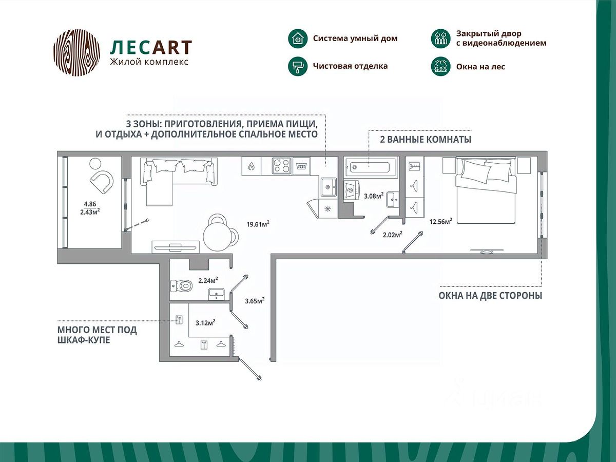 Продаётся 1-комнатная квартира 001, общей площадью 48.71 кв.м., на 1. Дом комфорт-класса, 12 этажей, в окружении леса и малоэтажной застройки. Проект с умным домом. Передача квартир в апреле 2026г.