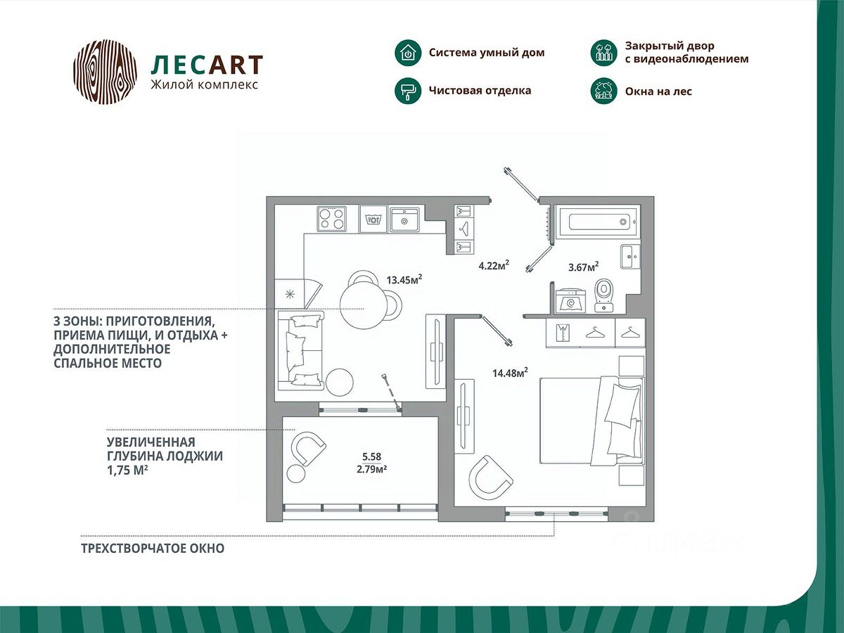 Продаётся 1-комнатная квартира 054, общей площадью 38.61 кв.м., на 2. Дом комфорт-класса, 12 этажей, в окружении леса и малоэтажной застройки. Проект с умным домом. Передача квартир в апреле 2026г.