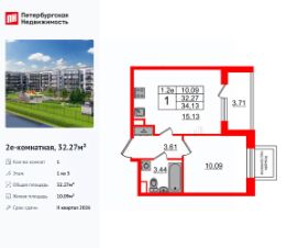 Удобная, классическая, функциональная европланировка, большая кухня-гостиная 15.13 м², вместительная прихожая 3.61 м². Общая площадь квартиры - 32.27 м², жилая 10.09 м², высота потолка 2.77 м.