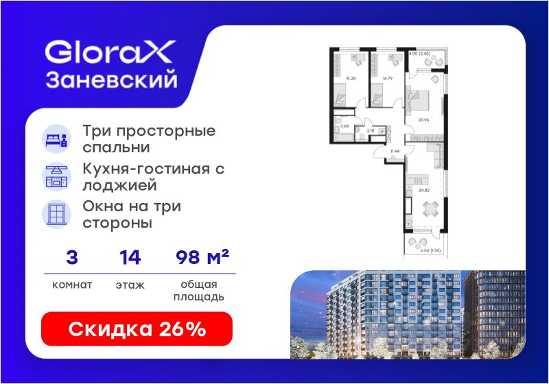 Продается 3-комнатная квартира 84 на 14-м этаже в сданном комплексе бизнес-класса GloraX Заневский.
