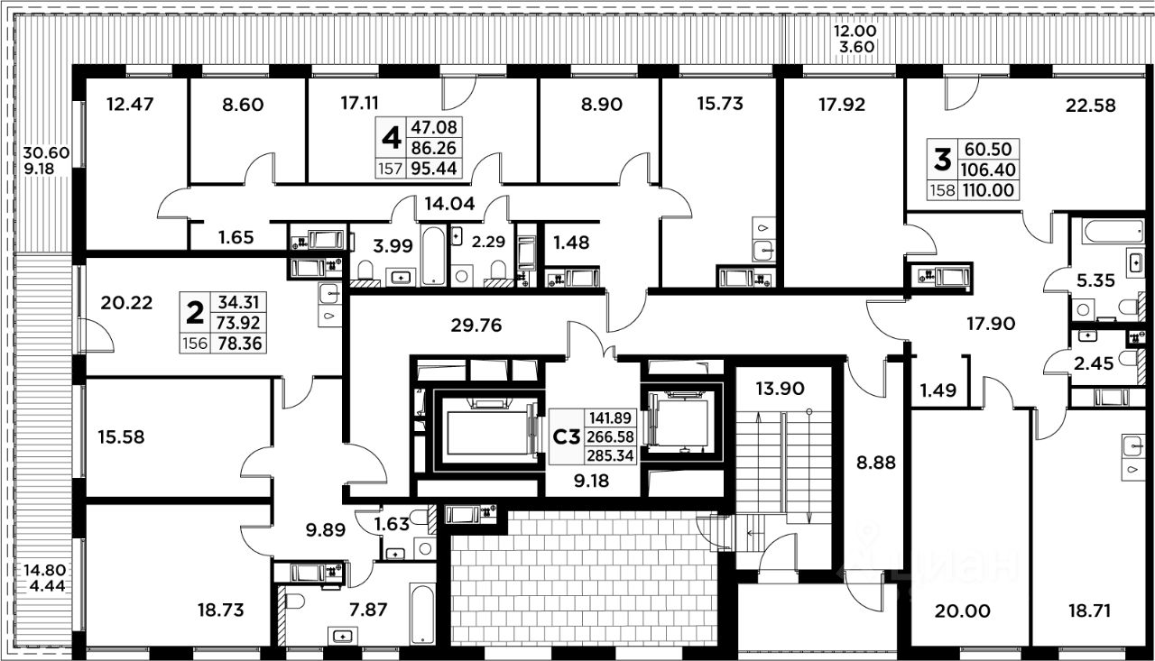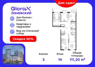 Продается 3-комн. квартира на 14-м этаже в проекте бизнес-класса GloraX Заневский. Общая площадь лота составляет 110,00 кв. м, из которых 60,50 кв. м отведено под жилую и 18,71 кв. м под кухонную зону. Номер квартиры - 158.