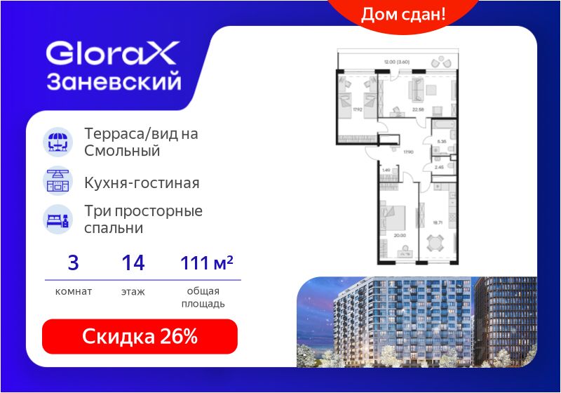 Продается 3-комнатная квартира 158 на 14-м этаже в сданном комплексе бизнес-класса GloraX Заневский.
