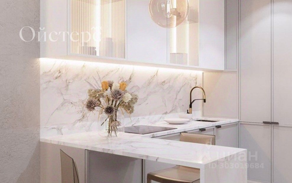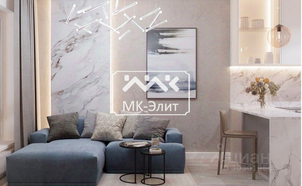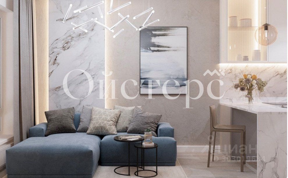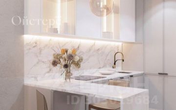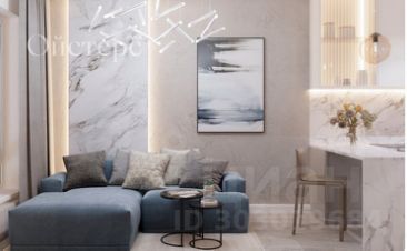 Сама квартира расположена на 5 этаже. Чистовая отделка — мрамор. Общая площадь Евро двухкомнатной квартиры 36.8 кв.м