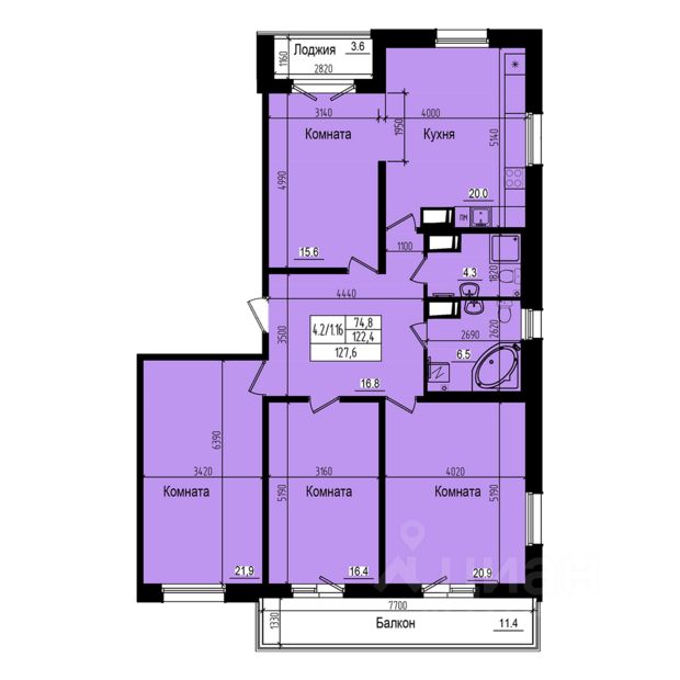 Общая площадь 127.6 кв.м, жилая площадь 74.8 кв.м.