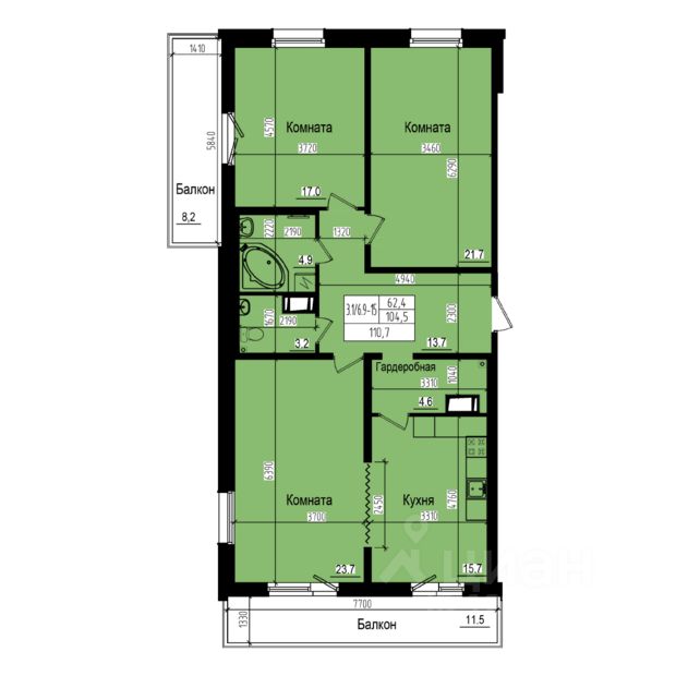 Продается большая трехкомнатная квартира (возможен заказ чистовой отделки, подробности уточняйте в отделе продаж). Общая площадь 110.7 м2, жилая - 62.4 м2, высокие потолки - 2.73 м. Планировка подойдет для семьи с детьми. В квартире - три просторные прямоугольные комнаты. Между большой комнатой и кухней отсутствует стена, что позволяет будущим жильцам самим решить, хотят они видеть просторную кухню-гостиную или отдельные помещения.