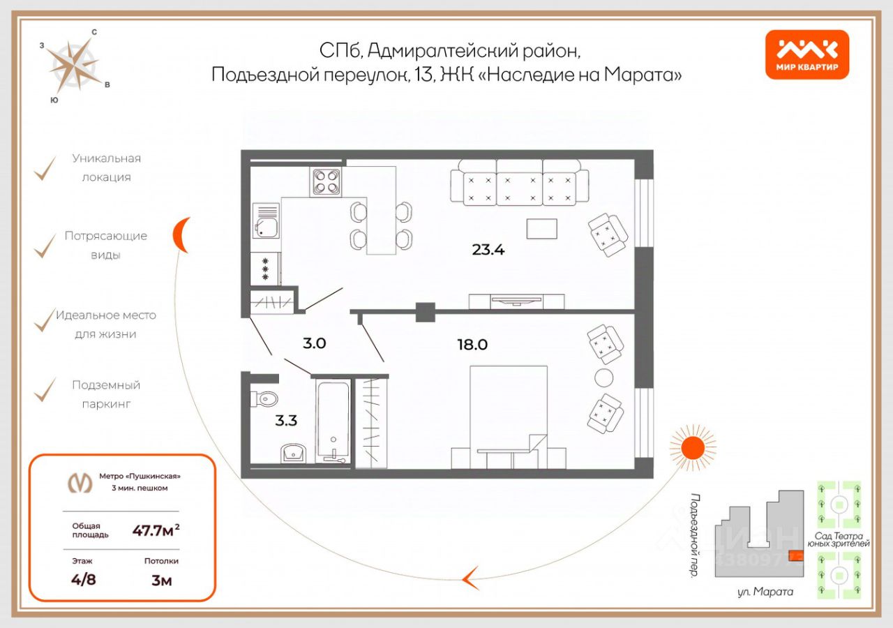 Арт. 68316879 Представляем вашему вниманию один из лучших вариантов в ЖК "Наследие на Марата" в исторической части центра Санкт-Петербурга. Данный комплекс идеальное место для жизни и отдыха.