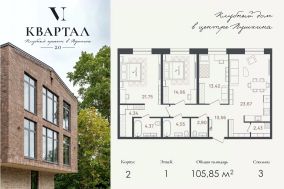 Предлагается в продажу квартира с эргономичной планировкой площадью 105,85 кв.м. В квартире запроектированы две детские со своей ванной комнатой, мастер-спальня с ванной и гардеробной, кухня-гостиная площадью 23,67 кв.м. Функционал планировки также дополнен гостевым санузлом, постирочной и просторным холлом.