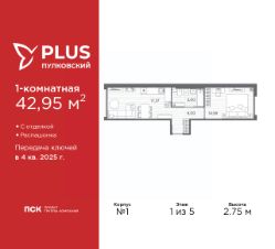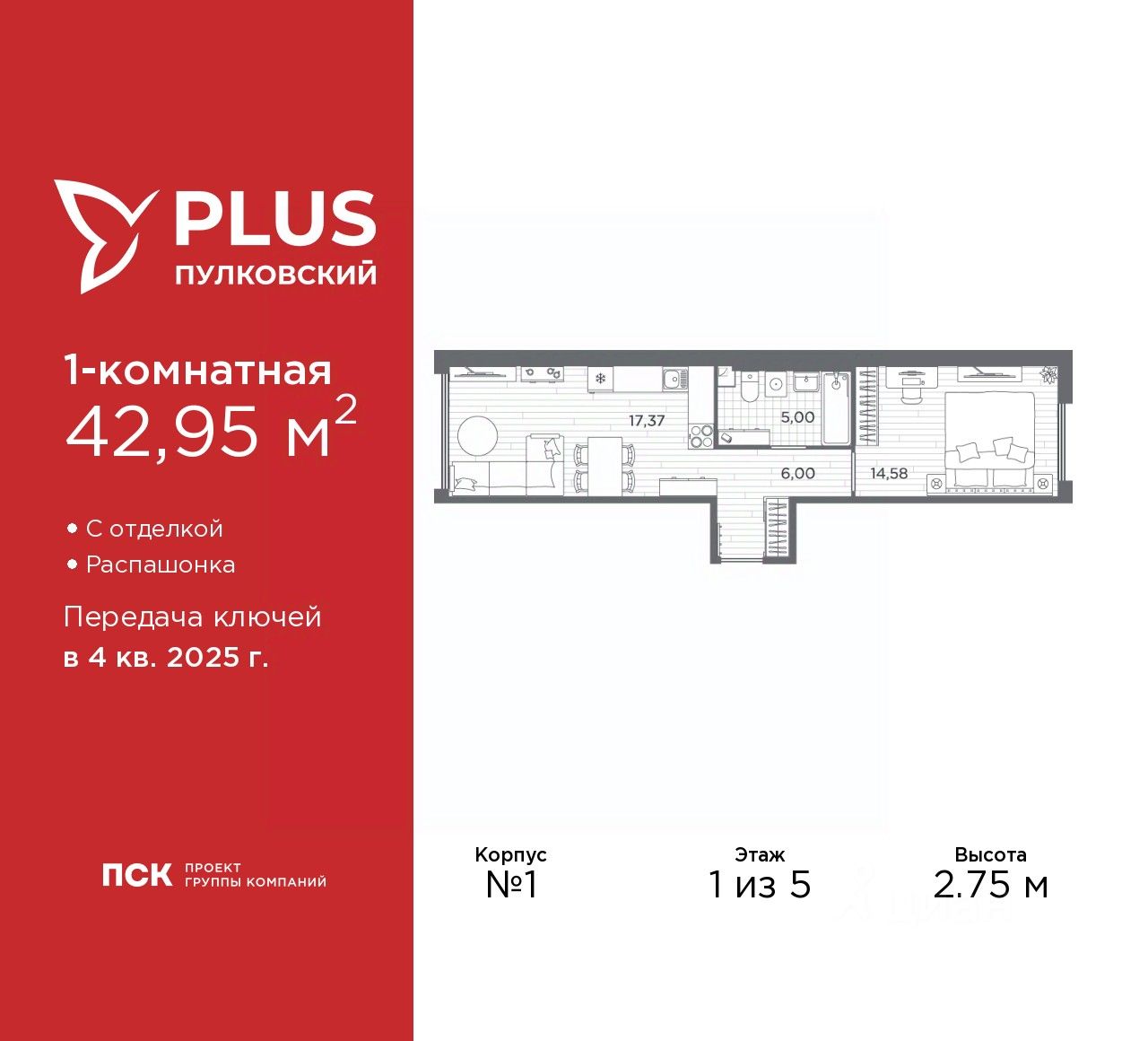 Однокомнатная квартира от застройщика с отделкой в ЖК "PLUS Пулковский" на 1 этаже. Общая площадь: 42.95 кв.м., жилая: 14.58 кв.м., площадь просторной кухни-столовой: 17.37 кв.м. Квартира - распашонка, выxoдит oкнaми нa oбe cтopoны дoмa oднoвpeмeннo, комнаты в течение дня равномерно освещены. В квартире один совмещенный санузел. Высота потолков 2.75 м.