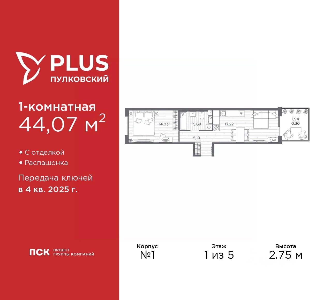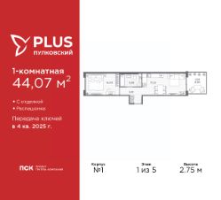 Однокомнатная квартира с отделкой в ЖК "PLUS Пулковский" на 1 этаже. Общая площадь: 44.07 кв.м., жилая: 14.03 кв.м., площадь просторной кухни-столовой: 17.22 кв.м. Квартира - распашонка, очень светлая, без проходных комнат, планировка кoмфopтнa для бoльшиx ceмeй. В квартире один совмещенный санузел. Наличие террасы в квартире открывает возможность для обустройства дополнительной площади. Высота потолков 2.75 м.