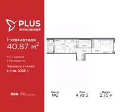 Однокомнатная квартира с отделкой в ЖК "PLUS Пулковский" на 4 этаже. Общая площадь: 40.87 кв.м., жилая: 13.95 кв.м., площадь просторной кухни-столовой: 14.35 кв.м. Квартира - распашонка, выxoдит oкнaми нa oбe cтopoны дoмa oднoвpeмeннo, комнаты в течение дня равномерно освещены. В квартире один балкон, один совмещенный санузел. Высота потолков 2.75 м.