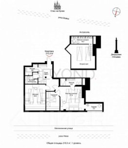 Квартира общей площадью 210 кв. м выполнена в изящном классическом дизайне с использованием высококачественных натуральных материалов. Квартира полностью оснащена технически (интегрированы системы вентиляции, кондиционирования, фильтрации воды). На первом уровне квартиры находятся основная спальня с собственной ванной комнатой, изолированной гардеробной и выходом на остекленный балкон, галерея-кабинет со встроенной библиотекой, детская комната со встроенными шкафами, ванная комната, постирочное техпомещение, холл-прихожая. На втором уровне расположены просторная гостиная, столовая зона со встроенной кухней, гостевой санузел, вместительное подсобное помещение  кладовая.