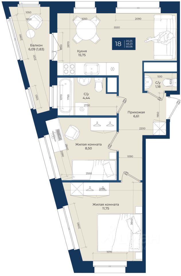 Жилой комплекс "Новатория", 1 очередь строительства, Корпус Б, Квартира 18 общей площадью 50,06 м2 на 4 этаже.ЖК "Новатория" —жилой комплекс комфорт-класса расположен в поселке Новоселье, в окружении леса и Шунгеровского заказника.