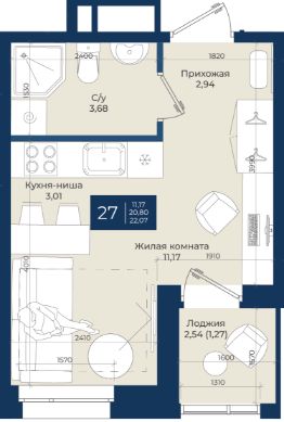 Жилой комплекс "Новатория", 1 очередь строительства, Корпус Б, Квартира 27 общей площадью 22,07 м2 на 6 этаже.ЖК "Новатория" —жилой комплекс комфорт-класса расположен в поселке Новоселье, в окружении леса и Шунгеровского заказника.