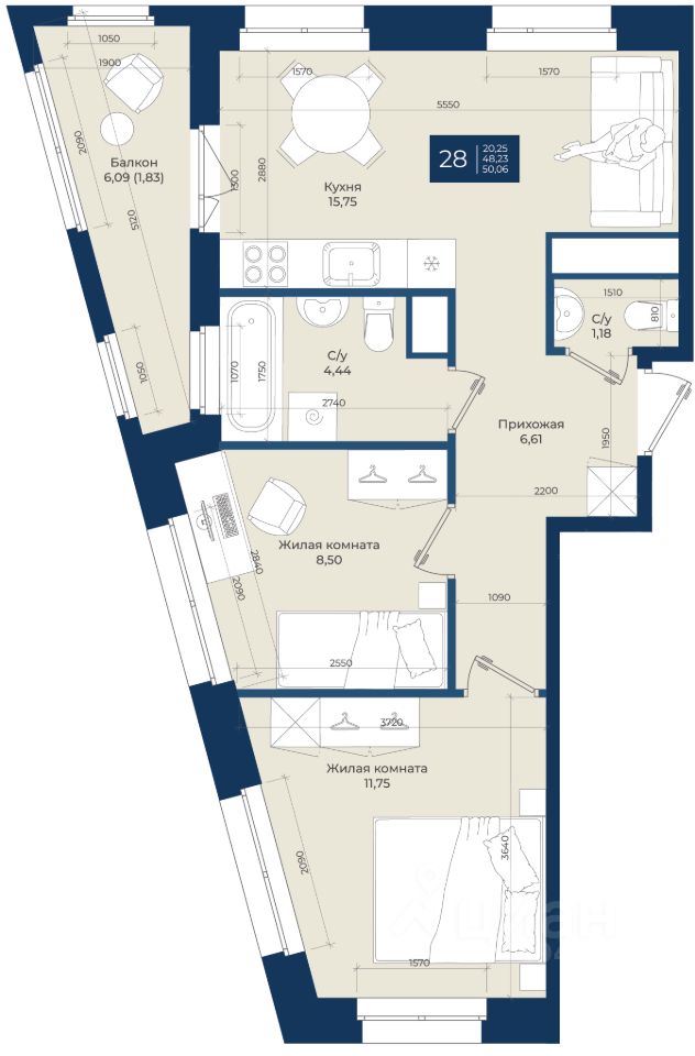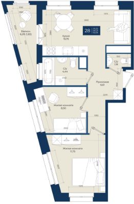 Жилой комплекс "Новатория", 1 очередь строительства, Корпус Б, Квартира 28 общей площадью 50,06 м2 на 6 этаже.ЖК "Новатория" —жилой комплекс комфорт-класса расположен в поселке Новоселье, в окружении леса и Шунгеровского заказника.