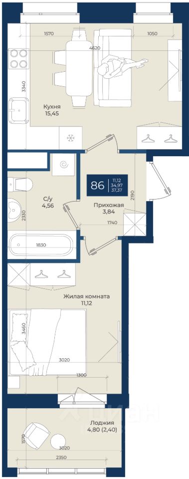 Жилой комплекс "Новатория", 1 очередь строительства, Корпус Б, Квартира 86 общей площадью 37,37 м2 на 6 этаже.ЖК "Новатория" —жилой комплекс комфорт-класса расположен в поселке Новоселье, в окружении леса и Шунгеровского заказника.