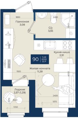 Жилой комплекс "Новатория", 1 очередь строительства, Корпус Б, Квартира 90 общей площадью 22,11 м2 на 7 этаже.ЖК "Новатория" —жилой комплекс комфорт-класса расположен в поселке Новоселье, в окружении леса и Шунгеровского заказника.
