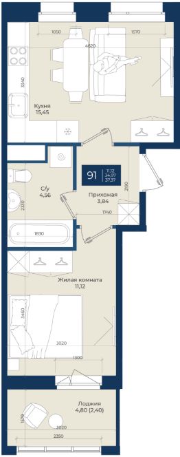 Жилой комплекс "Новатория", 1 очередь строительства, Корпус Б, Квартира 91 общей площадью 37,37 м2 на 7 этаже.ЖК "Новатория" —жилой комплекс комфорт-класса расположен в поселке Новоселье, в окружении леса и Шунгеровского заказника.