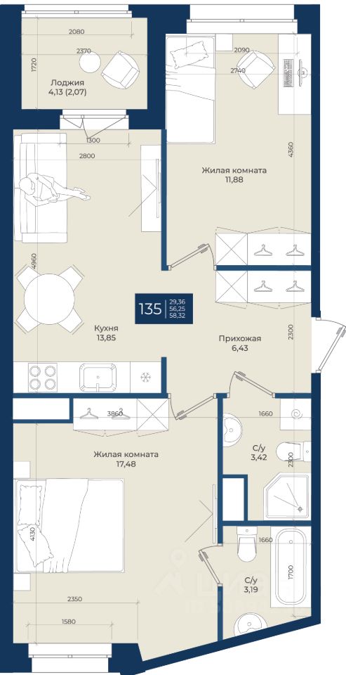 Жилой комплекс "Новатория", 1 очередь строительства, Корпус Б, Квартира 135 общей площадью 58,32 м2 на 6 этаже.ЖК "Новатория" —жилой комплекс комфорт-класса расположен в поселке Новоселье, в окружении леса и Шунгеровского заказника.