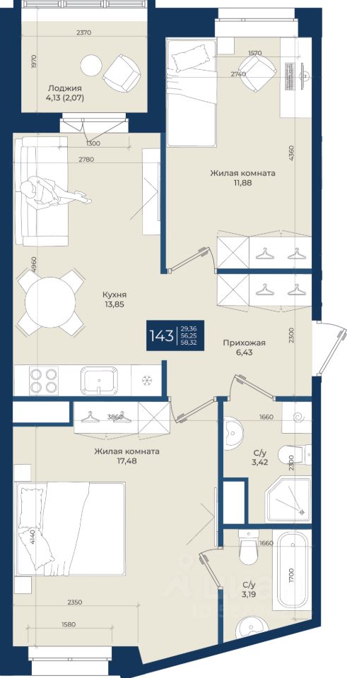 Жилой комплекс "Новатория", 1 очередь строительства, Корпус Б, Квартира 143 общей площадью 58,32 м2 на 8 этаже.ЖК "Новатория" —жилой комплекс комфорт-класса расположен в поселке Новоселье, в окружении леса и Шунгеровского заказника.