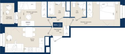 Жилой комплекс "Новатория", 1 очередь строительства, Корпус Б, Квартира 185 общей площадью 48,59 м2 на 7 этаже.ЖК "Новатория" —жилой комплекс комфорт-класса расположен в поселке Новоселье, в окружении леса и Шунгеровского заказника.