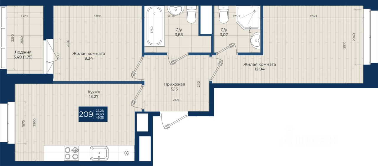 Жилой комплекс "Новатория", 1 очередь строительства, Корпус Б, Квартира 209 общей площадью 49,35 м2 на 1 этаже.ЖК "Новатория" —жилой комплекс комфорт-класса расположен в поселке Новоселье, в окружении леса и Шунгеровского заказника.