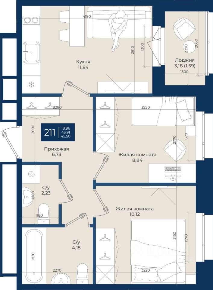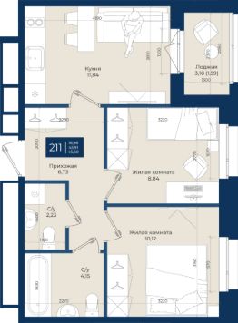 Жилой комплекс "Новатория", 1 очередь строительства, Корпус Б, Квартира 211 общей площадью 45,5 м2 на 2 этаже.ЖК "Новатория" —жилой комплекс комфорт-класса расположен в поселке Новоселье, в окружении леса и Шунгеровского заказника.