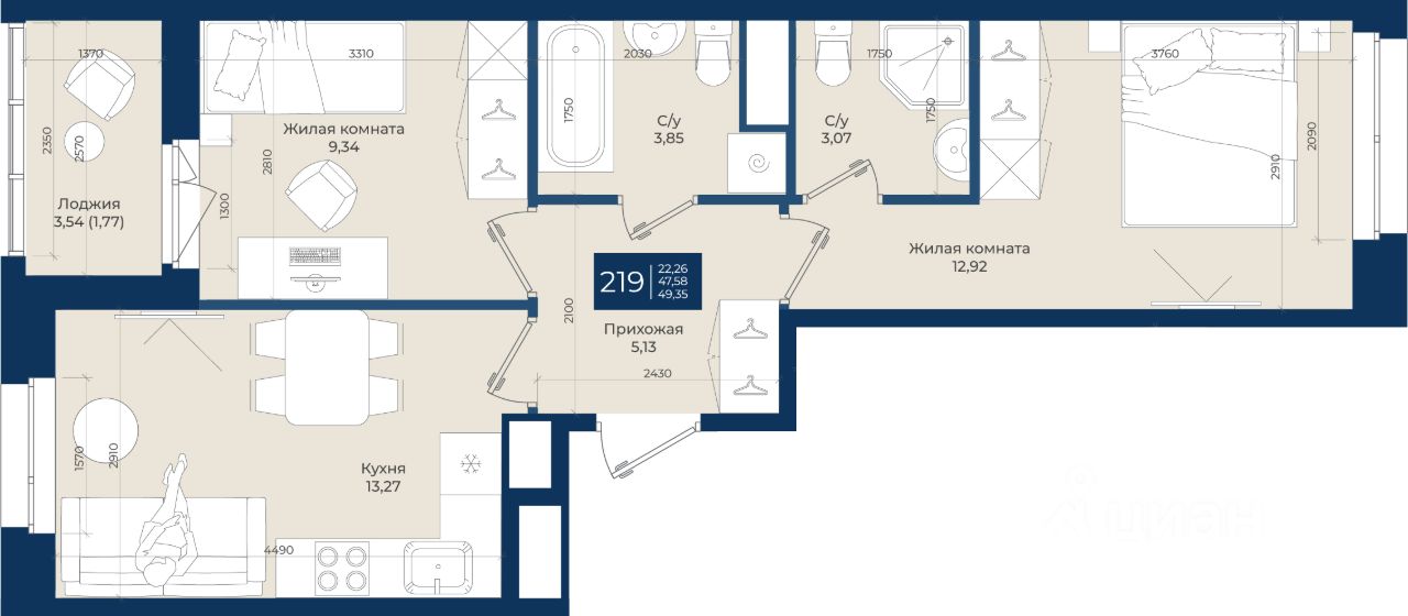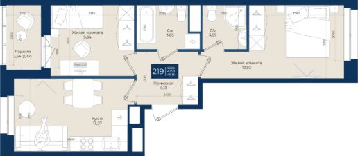 Жилой комплекс "Новатория", 1 очередь строительства, Корпус Б, Квартира 219 общей площадью 49,35 м2 на 5 этаже.ЖК "Новатория" —жилой комплекс комфорт-класса расположен в поселке Новоселье, в окружении леса и Шунгеровского заказника.