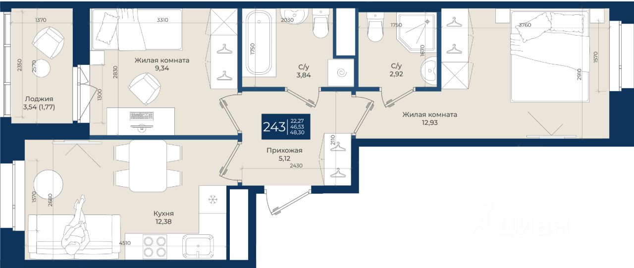 Жилой комплекс "Новатория", 1 очередь строительства, Корпус Б, Квартира 243 общей площадью 48,3 м2 на 2 этаже.ЖК "Новатория" —жилой комплекс комфорт-класса расположен в поселке Новоселье, в окружении леса и Шунгеровского заказника.