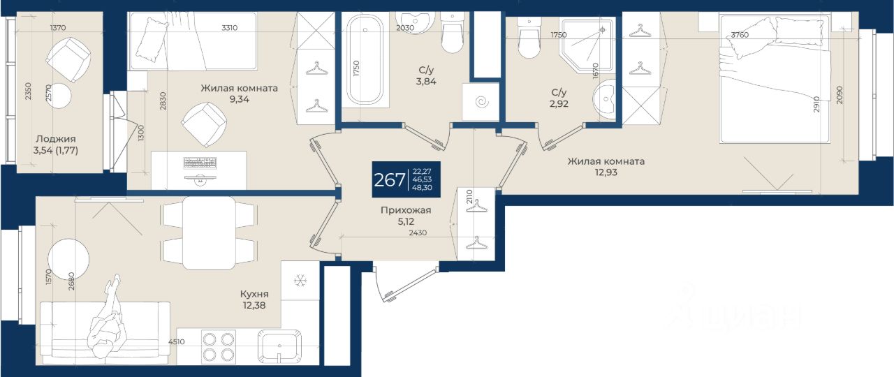 Жилой комплекс "Новатория", 1 очередь строительства, Корпус Б, Квартира 267 общей площадью 48,3 м2 на 8 этаже.ЖК "Новатория" —жилой комплекс комфорт-класса расположен в поселке Новоселье, в окружении леса и Шунгеровского заказника.