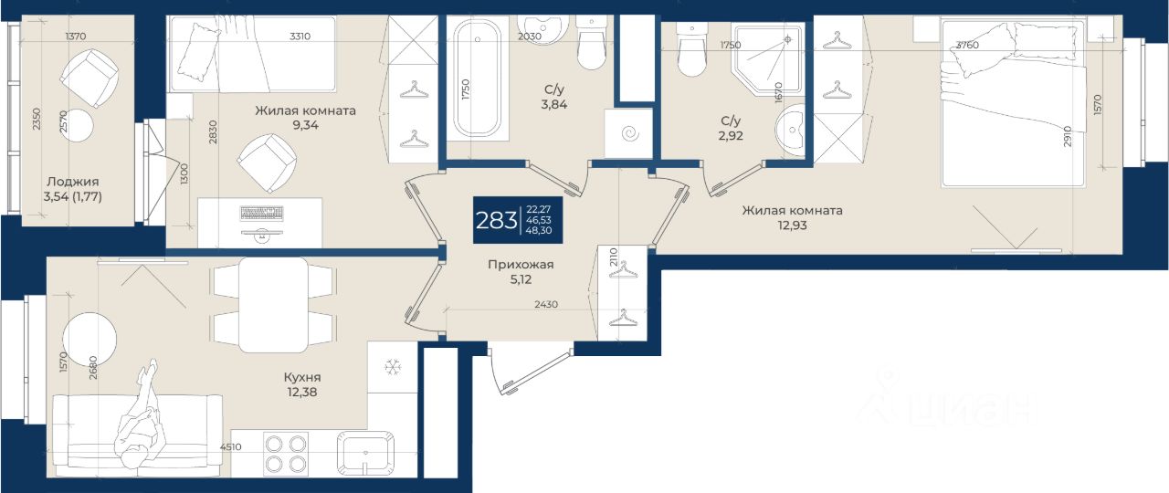 Жилой комплекс "Новатория", 1 очередь строительства, Корпус Б, Квартира 283 общей площадью 48,3 м2 на 12 этаже.ЖК "Новатория" —жилой комплекс комфорт-класса расположен в поселке Новоселье, в окружении леса и Шунгеровского заказника.
