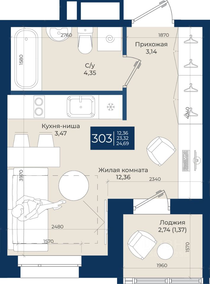 Жилой комплекс "Новатория", 1 очередь строительства, Корпус Б, Квартира 303 общей площадью 24,69 м2 на 4 этаже.ЖК "Новатория" —жилой комплекс комфорт-класса расположен в поселке Новоселье, в окружении леса и Шунгеровского заказника.