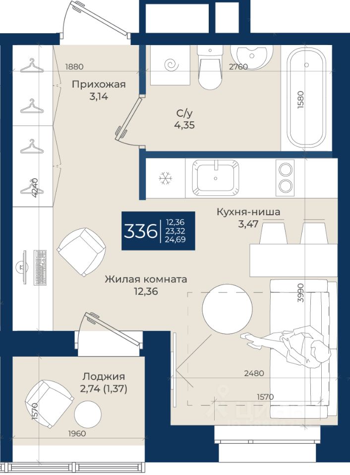 Жилой комплекс "Новатория", 1 очередь строительства, Корпус Б, Квартира 336 общей площадью 24,69 м2 на 10 этаже.ЖК "Новатория" —жилой комплекс комфорт-класса расположен в поселке Новоселье, в окружении леса и Шунгеровского заказника.