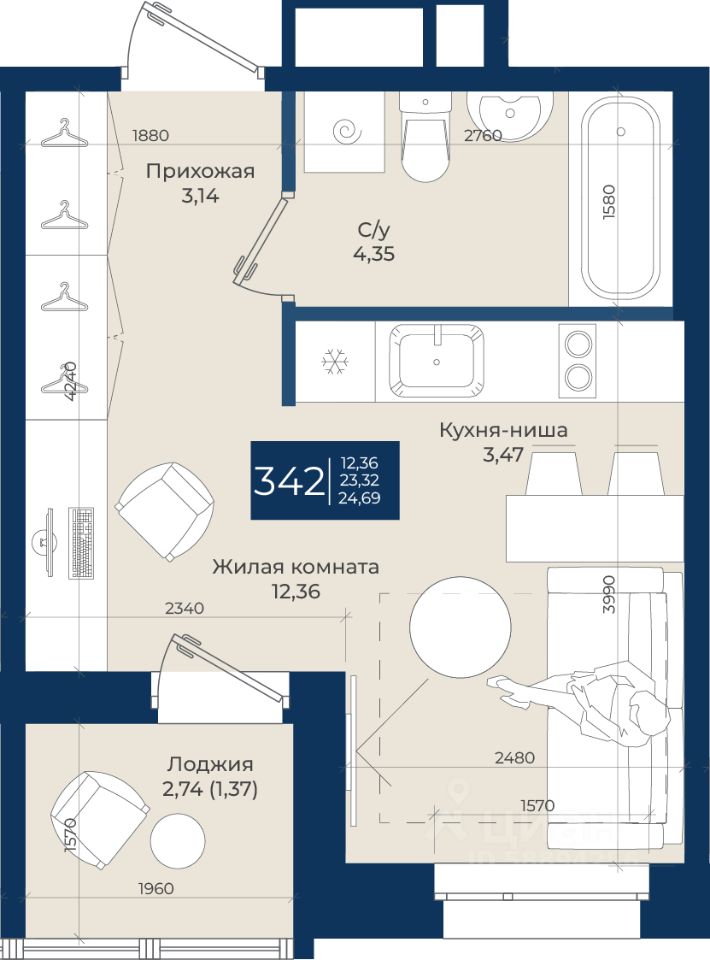 Жилой комплекс "Новатория", 1 очередь строительства, Корпус Б, Квартира 342 общей площадью 24,69 м2 на 11 этаже.ЖК "Новатория" —жилой комплекс комфорт-класса расположен в поселке Новоселье, в окружении леса и Шунгеровского заказника.