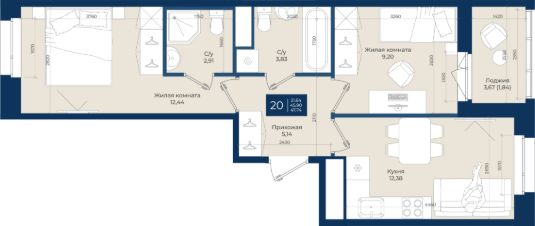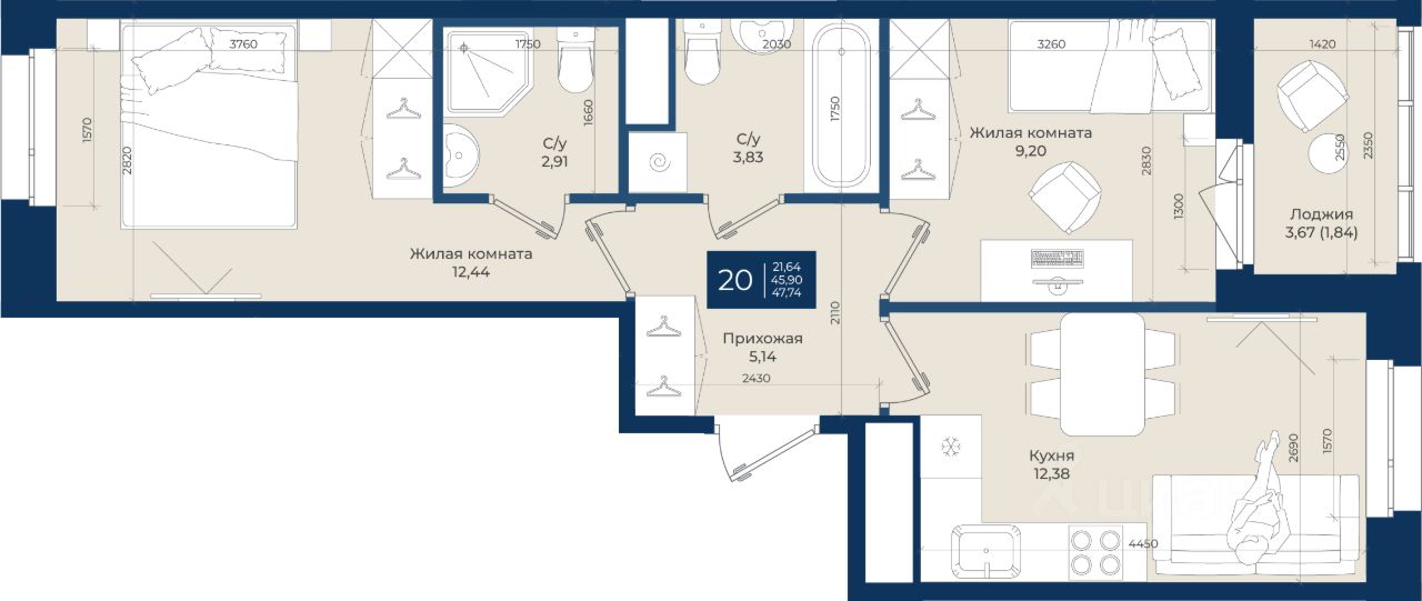 Жилой комплекс "Новатория", 1 очередь строительства, Корпус А, Квартира 20 общей площадью 47,74 м2 на 6 этаже.ЖК "Новатория" —жилой комплекс комфорт-класса расположен в поселке Новоселье, в окружении леса и Шунгеровского заказника.