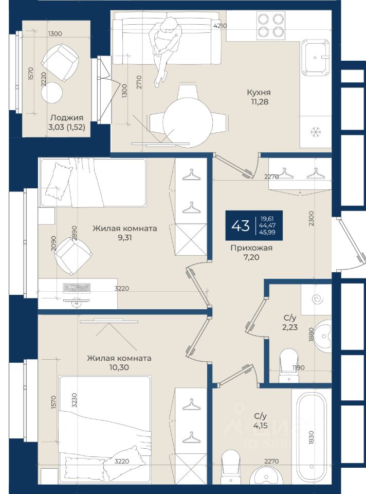 Жилой комплекс "Новатория", 1 очередь строительства, Корпус А, Квартира 43 общей площадью 45,99 м2 на 12 этаже.ЖК "Новатория" —жилой комплекс комфорт-класса расположен в поселке Новоселье, в окружении леса и Шунгеровского заказника.