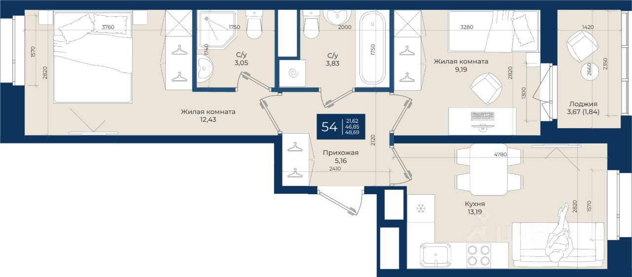 Жилой комплекс "Новатория", 1 очередь строительства, Корпус А, Квартира 54 общей площадью 48,69 м2 на 4 этаже.ЖК "Новатория" —жилой комплекс комфорт-класса расположен в поселке Новоселье, в окружении леса и Шунгеровского заказника.