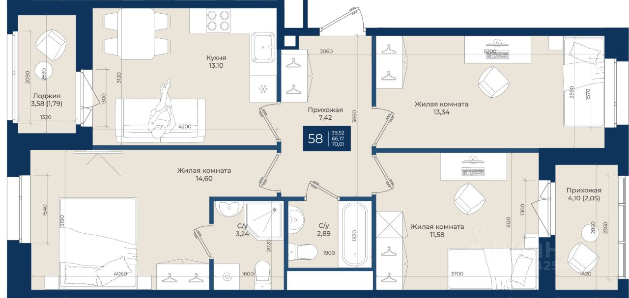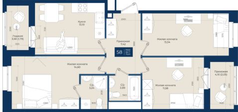 Жилой комплекс "Новатория", 1 очередь строительства, Корпус А, Квартира 58 общей площадью 70,01 м2 на 6 этаже.ЖК "Новатория" —жилой комплекс комфорт-класса расположен в поселке Новоселье, в окружении леса и Шунгеровского заказника.