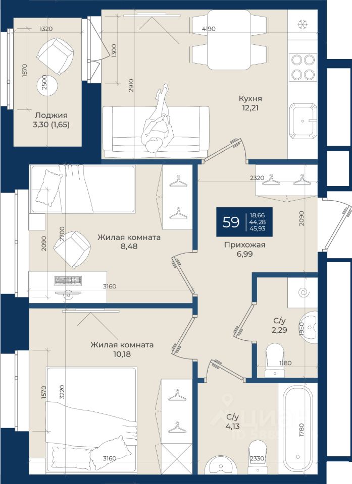 Жилой комплекс "Новатория", 1 очередь строительства, Корпус А, Квартира 59 общей площадью 45,93 м2 на 6 этаже.ЖК "Новатория" —жилой комплекс комфорт-класса расположен в поселке Новоселье, в окружении леса и Шунгеровского заказника.