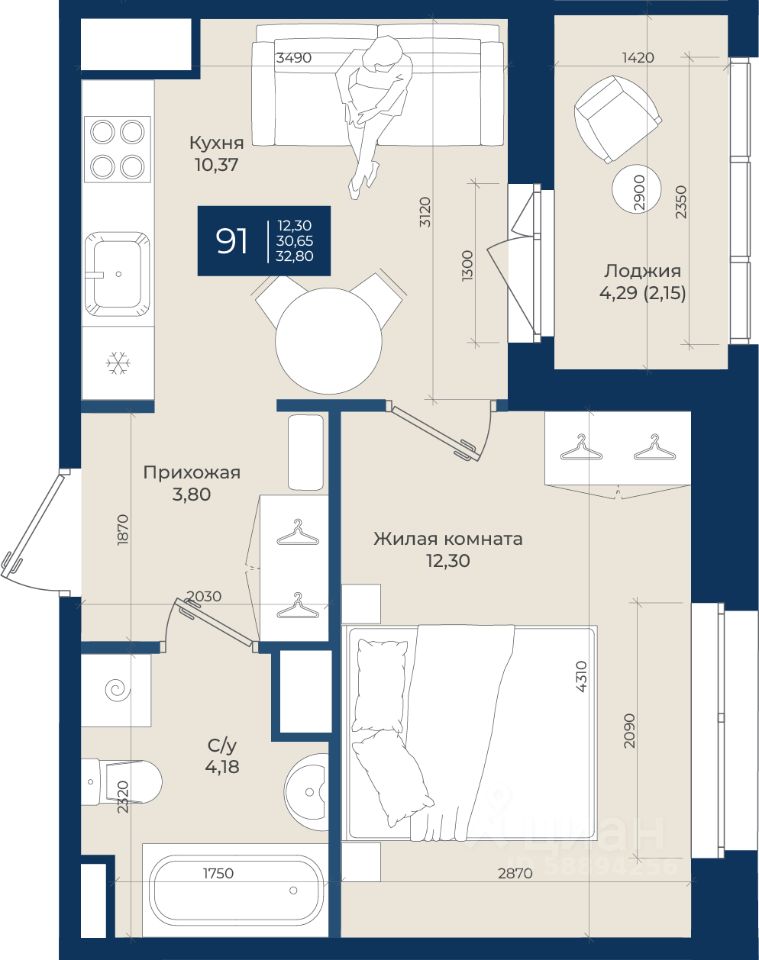 Жилой комплекс "Новатория", 1 очередь строительства, Корпус А, Квартира 91 общей площадью 32,8 м2 на 2 этаже.ЖК "Новатория" —жилой комплекс комфорт-класса расположен в поселке Новоселье, в окружении леса и Шунгеровского заказника.