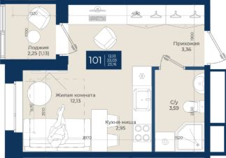 Жилой комплекс "Новатория", 1 очередь строительства, Корпус А, Квартира 101 общей площадью 23,16 м2 на 4 этаже.ЖК "Новатория" —жилой комплекс комфорт-класса расположен в поселке Новоселье, в окружении леса и Шунгеровского заказника.