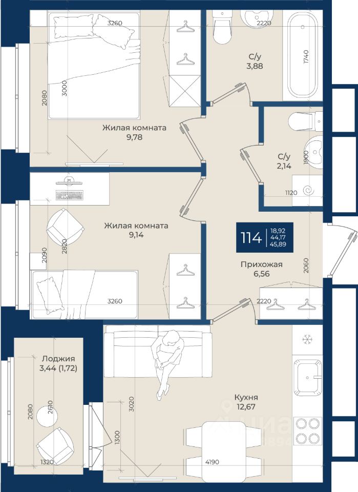 Жилой комплекс "Новатория", 1 очередь строительства, Корпус А, Квартира 114 общей площадью 45,89 м2 на 6 этаже.ЖК "Новатория" —жилой комплекс комфорт-класса расположен в поселке Новоселье, в окружении леса и Шунгеровского заказника.