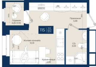 Жилой комплекс "Новатория", 1 очередь строительства, Корпус А, Квартира 115 общей площадью 23,16 м2 на 6 этаже.ЖК "Новатория" —жилой комплекс комфорт-класса расположен в поселке Новоселье, в окружении леса и Шунгеровского заказника.