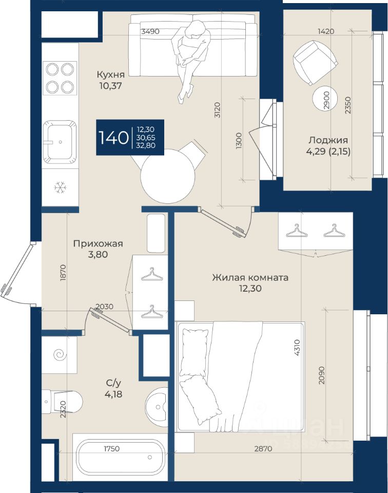 Жилой комплекс "Новатория", 1 очередь строительства, Корпус А, Квартира 140 общей площадью 32,8 м2 на 9 этаже.ЖК "Новатория" —жилой комплекс комфорт-класса расположен в поселке Новоселье, в окружении леса и Шунгеровского заказника.