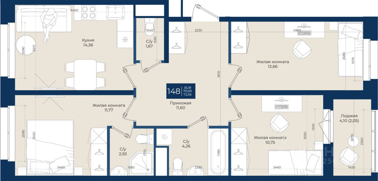 Жилой комплекс "Новатория", 1 очередь строительства, Корпус А, Квартира 148 общей площадью 72,05 м2 на 11 этаже.ЖК "Новатория" —жилой комплекс комфорт-класса расположен в поселке Новоселье, в окружении леса и Шунгеровского заказника.