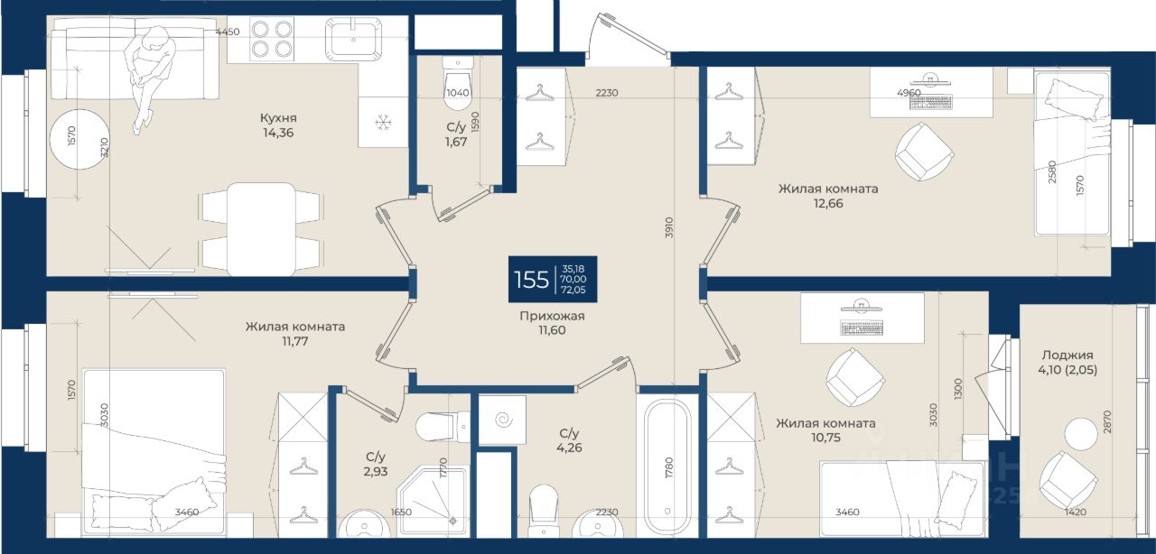 Жилой комплекс "Новатория", 1 очередь строительства, Корпус А, Квартира 155 общей площадью 72,05 м2 на 12 этаже.ЖК "Новатория" —жилой комплекс комфорт-класса расположен в поселке Новоселье, в окружении леса и Шунгеровского заказника.
