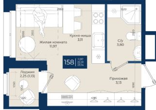 Жилой комплекс "Новатория", 1 очередь строительства, Корпус А, Квартира 158 общей площадью 23,14 м2 на 12 этаже.ЖК "Новатория" —жилой комплекс комфорт-класса расположен в поселке Новоселье, в окружении леса и Шунгеровского заказника.