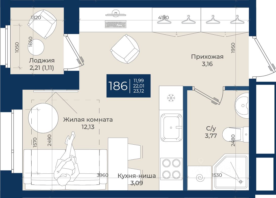 Жилой комплекс "Новатория", 1 очередь строительства, Корпус А, Квартира 186 общей площадью 23,12 м2 на 4 этаже.ЖК "Новатория" —жилой комплекс комфорт-класса расположен в поселке Новоселье, в окружении леса и Шунгеровского заказника.